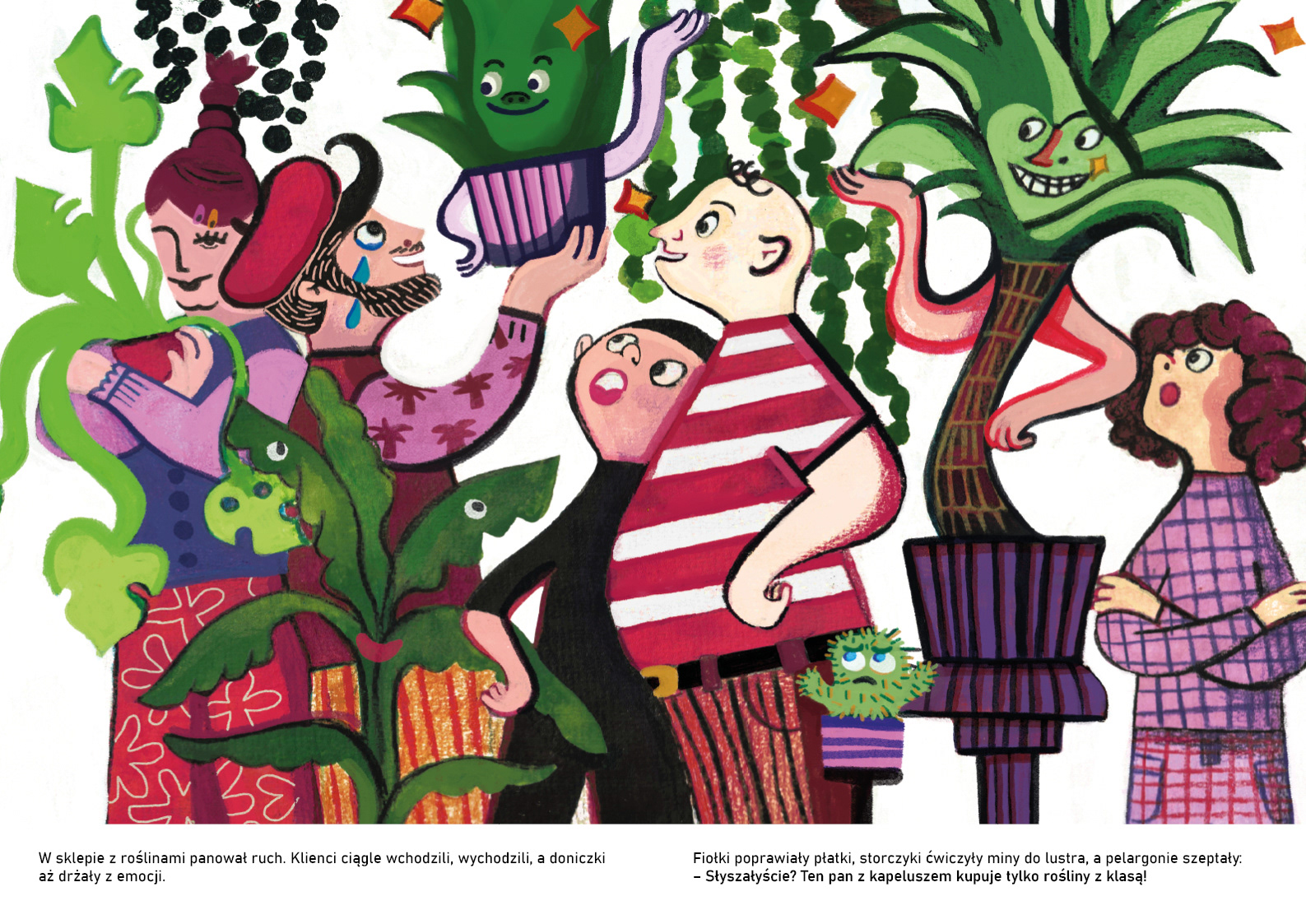 A trial Illustration for children book by Agnieszka Kamiński "The Cactus That Didn’t Want to Be Sold, a beautiful story for children that unfolds at a flower shop. The shop is full of people, which I illustrated on my page. The main character is a lovely Cactus.